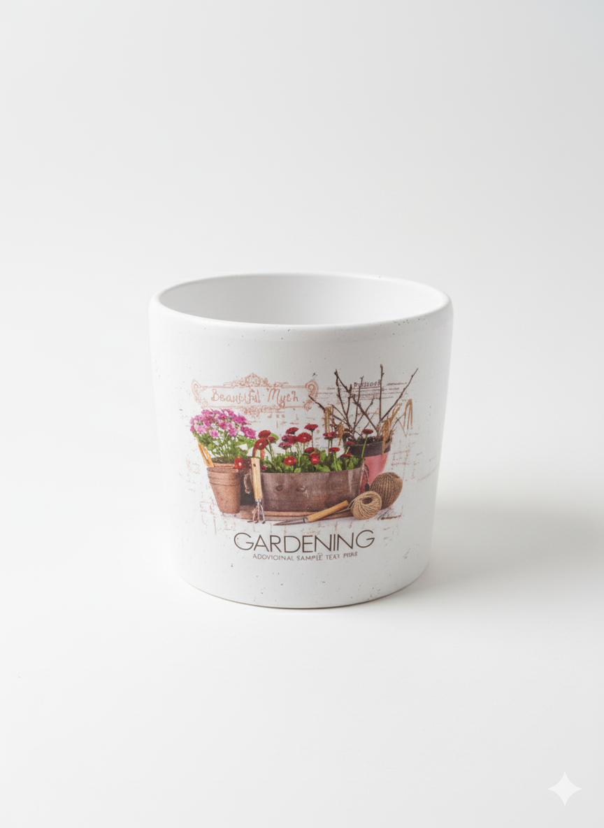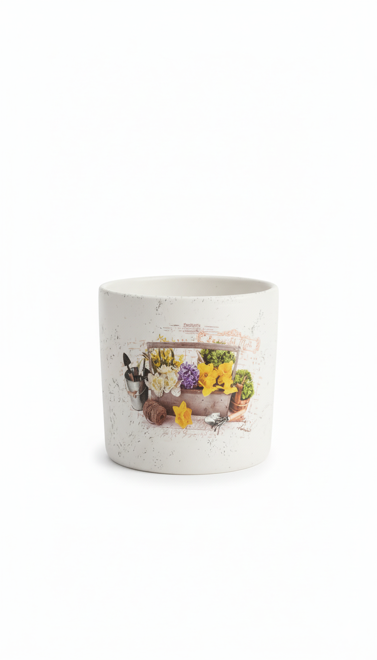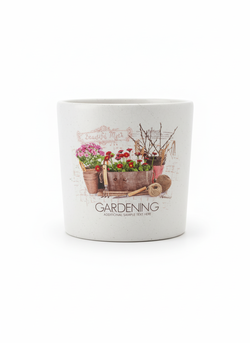 Ghiveciul ceramic „Gardening” este alegerea perfectă pentru cei care iubesc natura și decorurile cu suflet. Cu un design alb mat, imprimeu floral delicat și text vintage, acest ghiveci adaugă o notă rustic-elegantă oricărui spațiu. Este realizat din ceramică groasă, de calitate superioară, cu finisaj ușor texturat și nuanțe calde care se potrivesc perfect în decoruri de interior sau grădină.