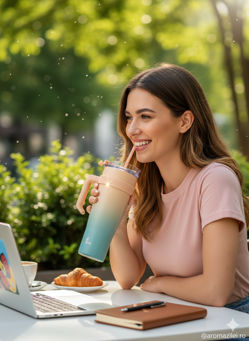 Capacul cu paie transparentă integrată este complet leak-proof, perfect pentru birou, mașină sau drumeții.