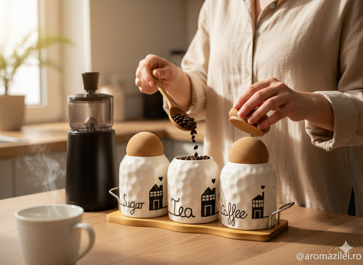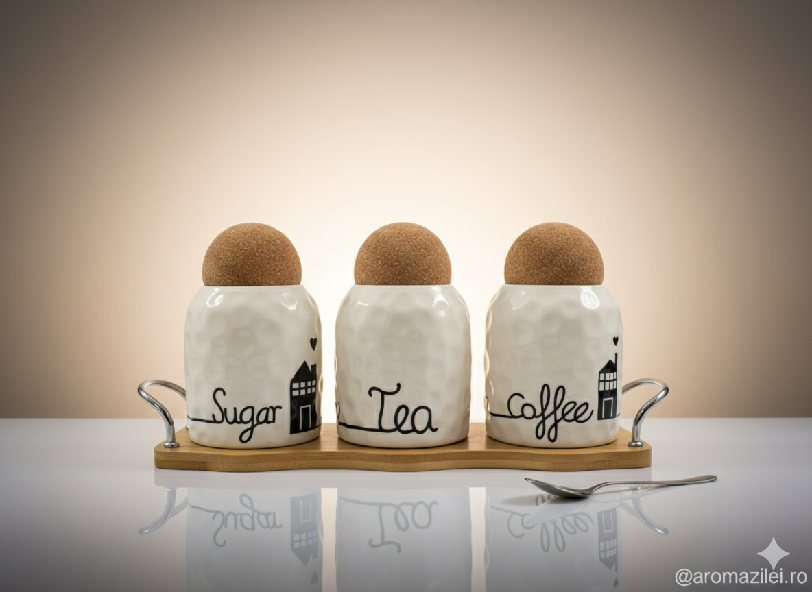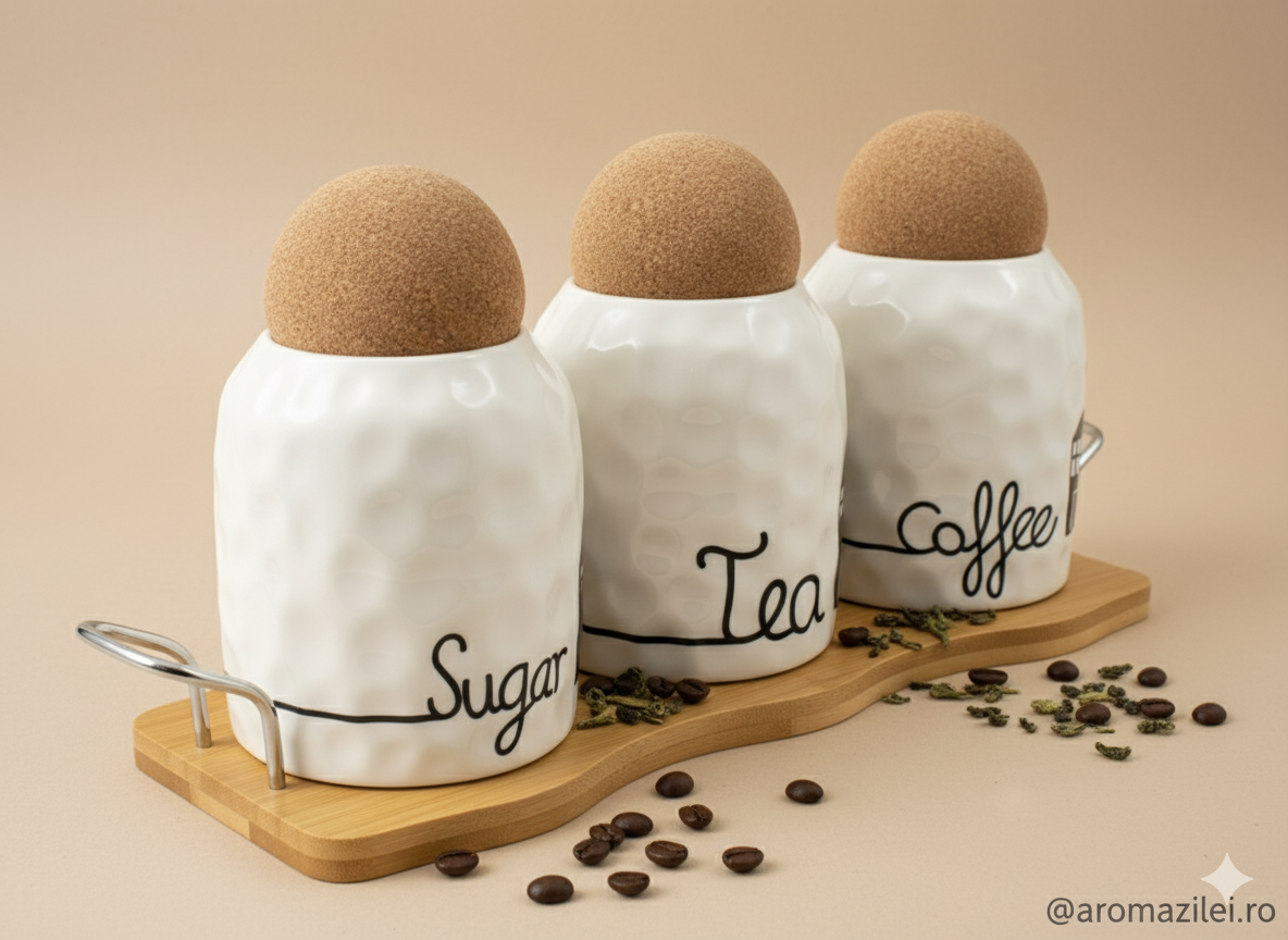 Depozitare elegantă pentru cafea, ceai, zahăr, condimente, miere