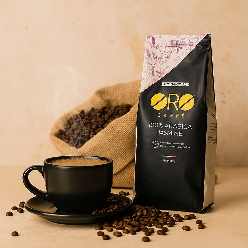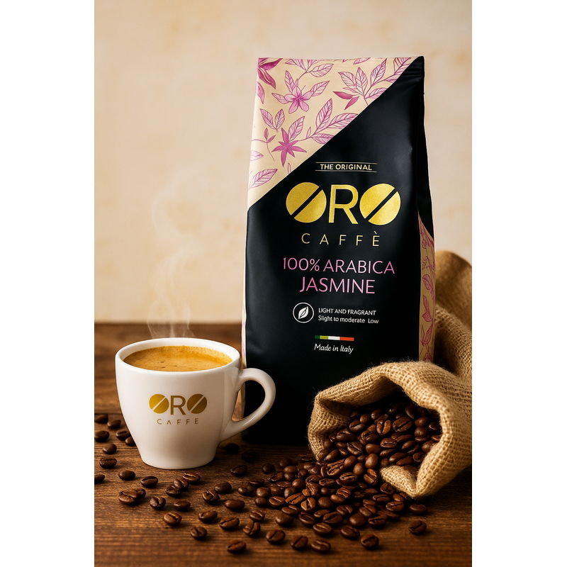 Cafea ORO Arabica Jasmine – 500g boabe – Blend floral, delicat.Arome elegante de iasomie și trandafir, prăjite artizanal în Italia.