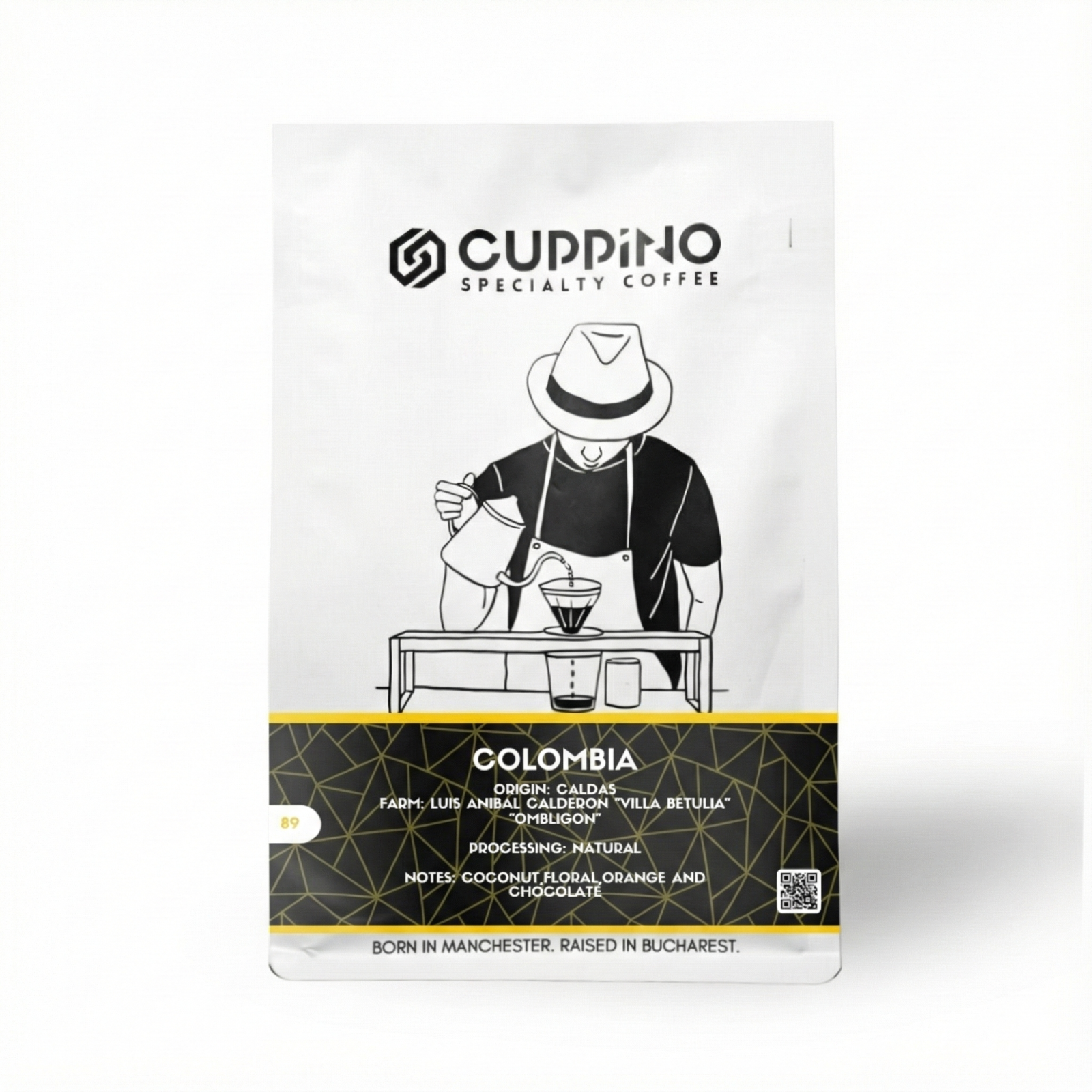 Cafea boabe Cuppino Colombia Caldas – 250 g este o cafea de origine single origin, 100% Arabica, cu procesare naturală și scor de specialitate 89 puncte. Provenită din ferma Villa Betulia (Luis Aníbal Calderón), această cafea oferă un profil aromatic elegant, cu note de cocos, flori, portocală și ciocolată, ideală pentru espresso rafinat și băuturi cu lapte.